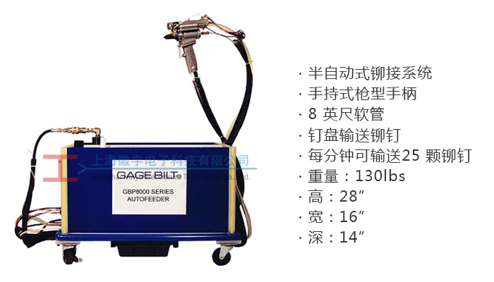 Gage Bilt自動鉚接工作站可安裝直徑3/32”-1/4”所有材質(zhì)鉚釘 Gage Bilt GB8000系列半自動鉚接系統(tǒng)應(yīng)用一個手持式槍型鉚接工具。此工具由一根8英尺長的管與工作站連接。釘盤里的鉚釘在氣壓的作用下通過送料器自動被輸送到槍嘴。然后通過真空系統(tǒng)被拉入工具內(nèi),同時排出廢釘桿。此裝置需要110psi真空氣壓、最小80psi和10CFM的壓縮氣體。它每分鐘可輸送25顆鉚釘。